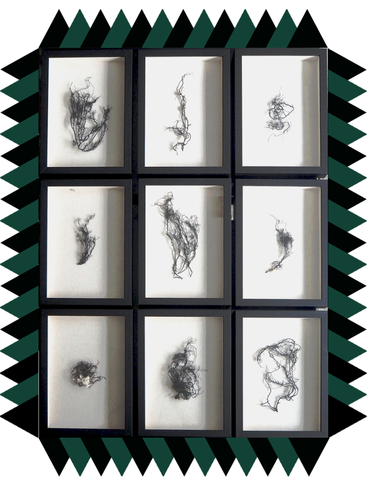 Recopilando unas ramitas marinas negras, mitad alga mitad coral, -piezas únicas de carácter orgánico- logramos formar una composición de nueve unidades únicas y distintas entre sí. La oscuridad de las algas contrasta con la textura clara y sutil del lino al que van sujetas con un fino y casi invisible hilo de latón.
