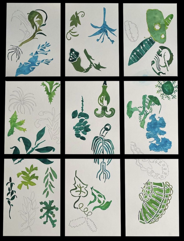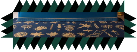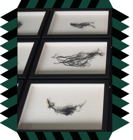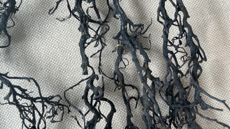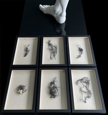Recopilando unas ramitas marinas negras, mitad alga mitad coral, -piezas únicas de carácter orgánico- logramos formar una composición de nueve unidades únicas y distintas entre sí. La oscuridad de las algas contrasta con la textura clara y sutil del lino al que van sujetas con un fino y casi invisible hilo de latón.